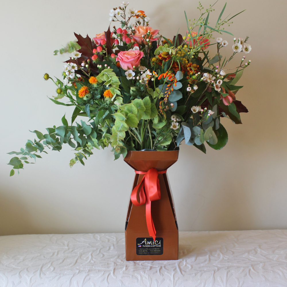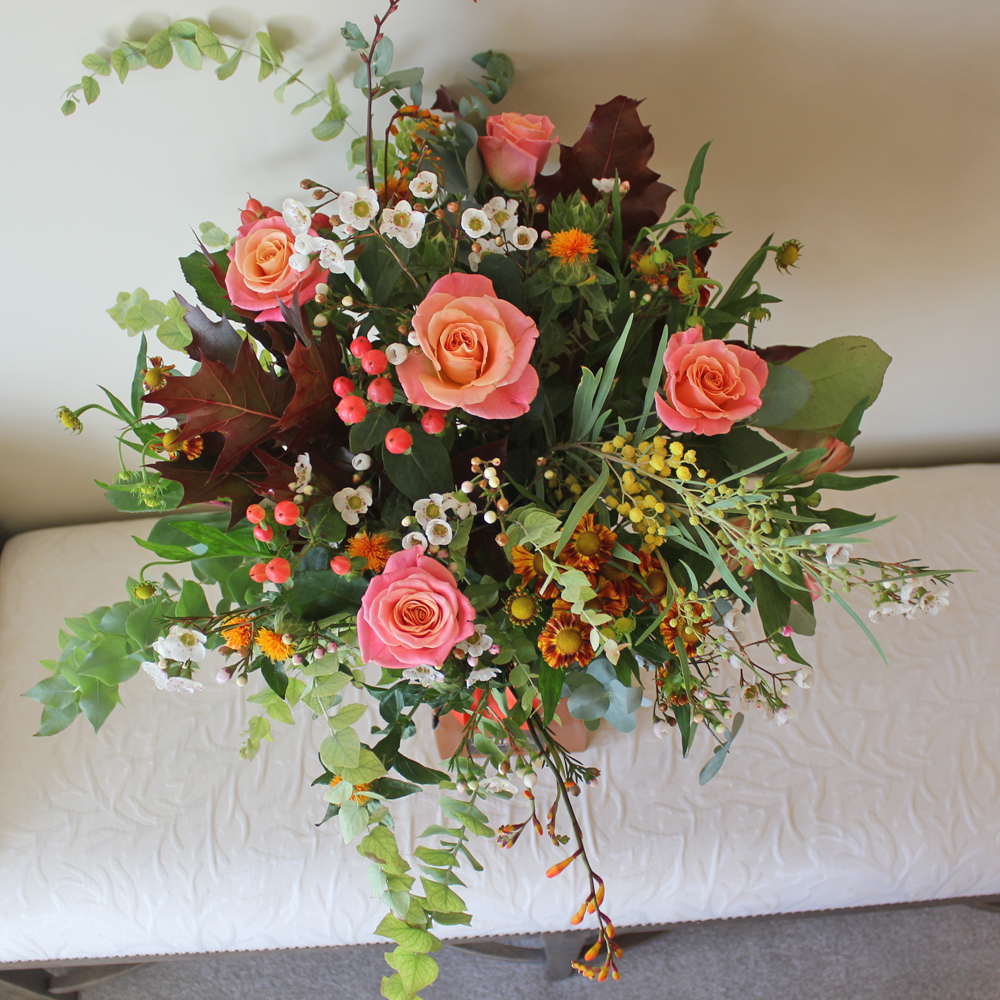 Beautiful – arranged in brown aqua vase complete with orange ribbon using miss piggy rose, crocosmia, wax flower, hypericim berries, helenium, carthamus, together with oak leaves and mixed foliages.