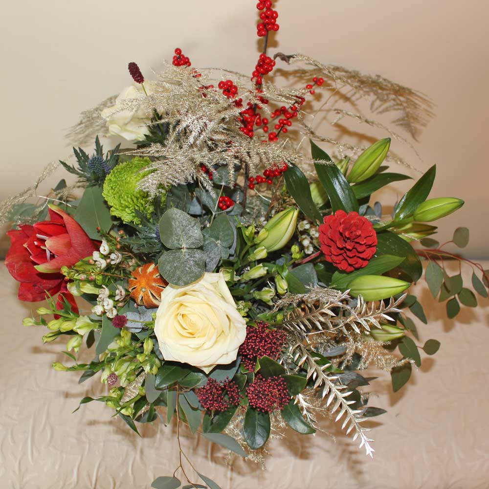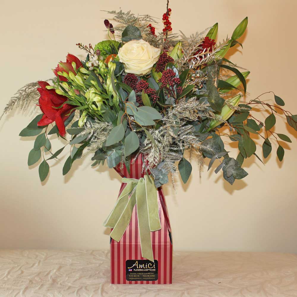Presented in Amici’s signature red aqua vase using a stunning mix of seasonal flowers with lush foilages to create a wonderful scent through the festive season.