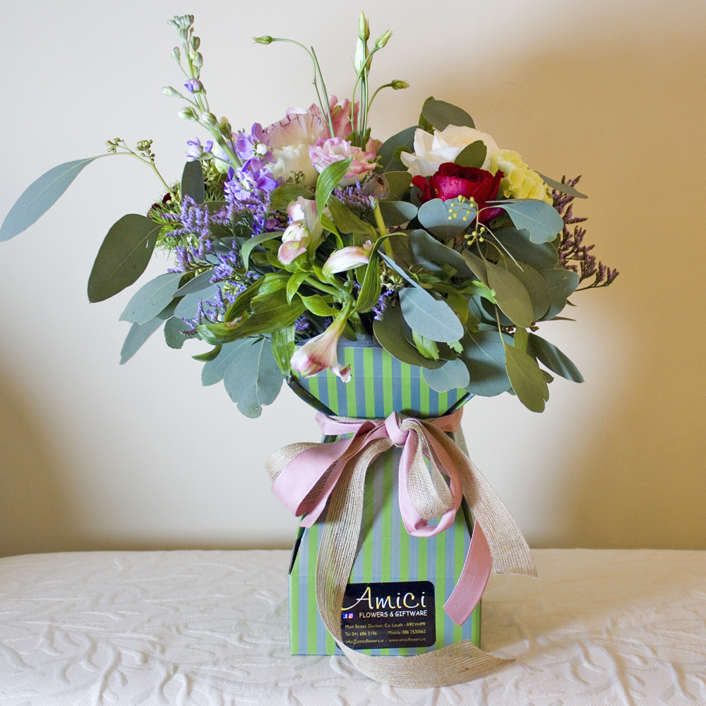 A pretty bouquet handtied – perfect for any occasion – filled with Roses, Lisanthus, Stock, Alstromeria, Ranunculus, Emille, displayed in Aqua Box with natural Raffia and Pink Bow.