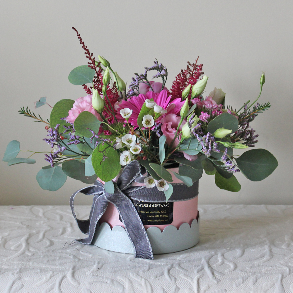 Perfectly arranged with summer blooms using a circular Hat Box trimmed with Grey Ribbon, Hydrangea, Paeonia, Lisanthus, Roses, Hypericum Green and Poppy Euca. Perfect gift for table centre  for any occasion