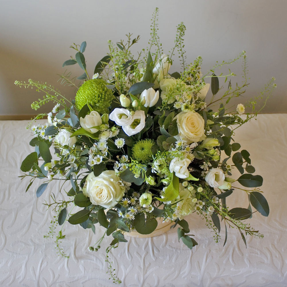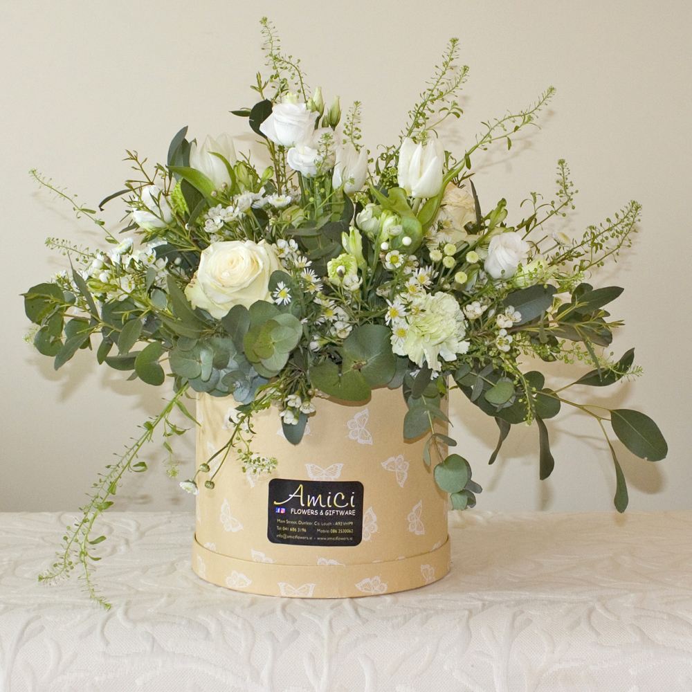 Perfect for everything special. This Hat Box is filled with Cream Roses, Lisanthus, Tulips, Green Blooms, Wax Flowers, together with a mixture of Foliages. A firm favourite.