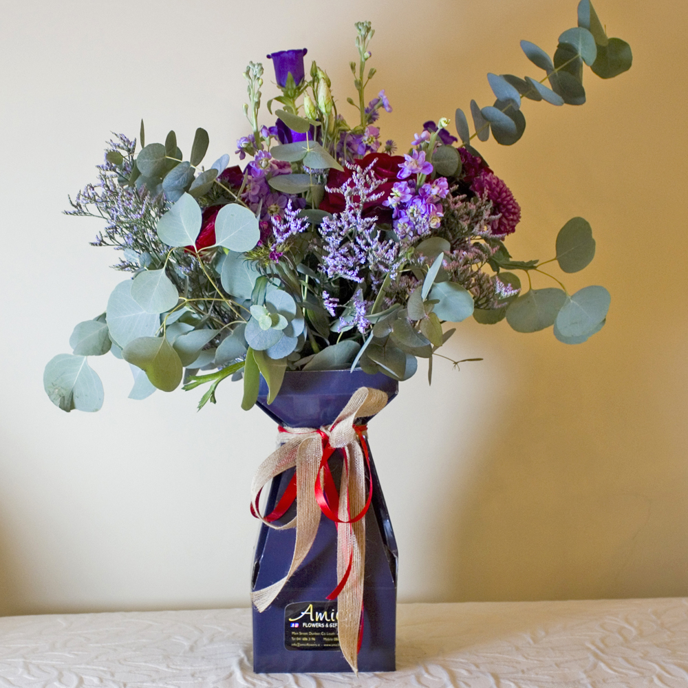Admire this Bouquet created with love in mind filled with Red Rose Campanula Stock, Sweet William, Eucalyptus, displayed in Aqua Navy Completed with Natural and Red Ribbon.